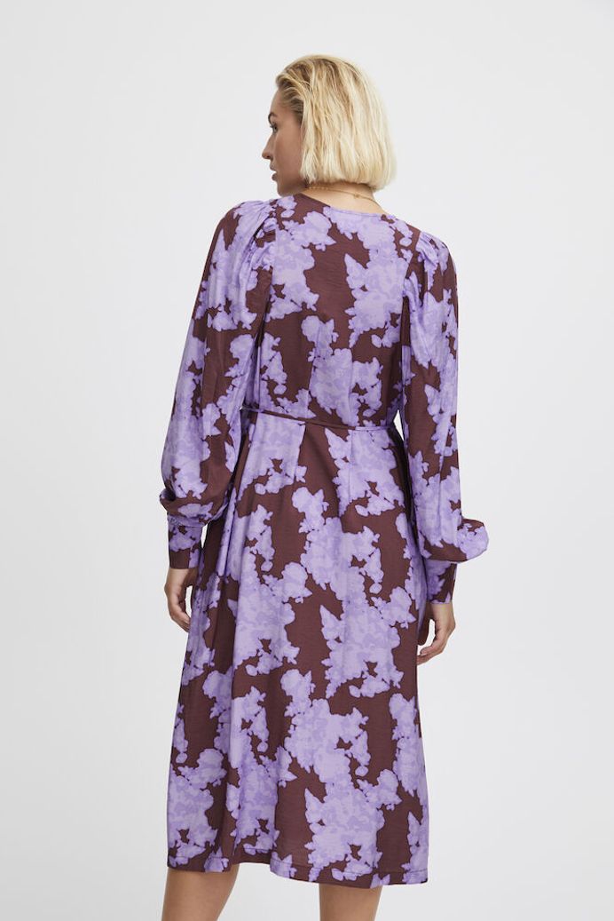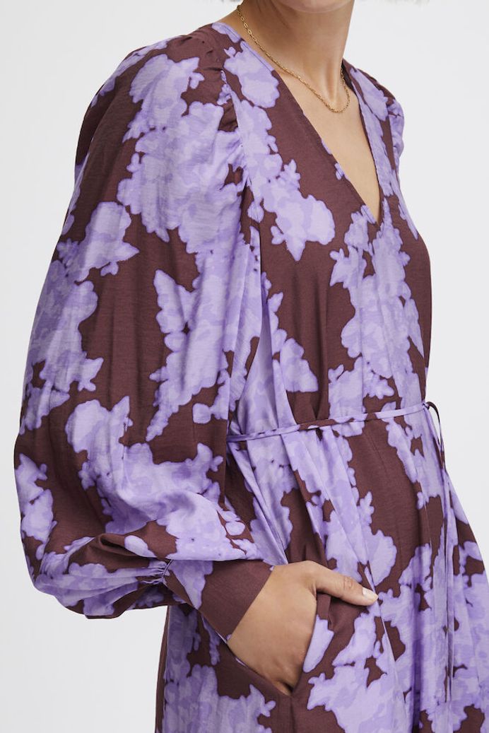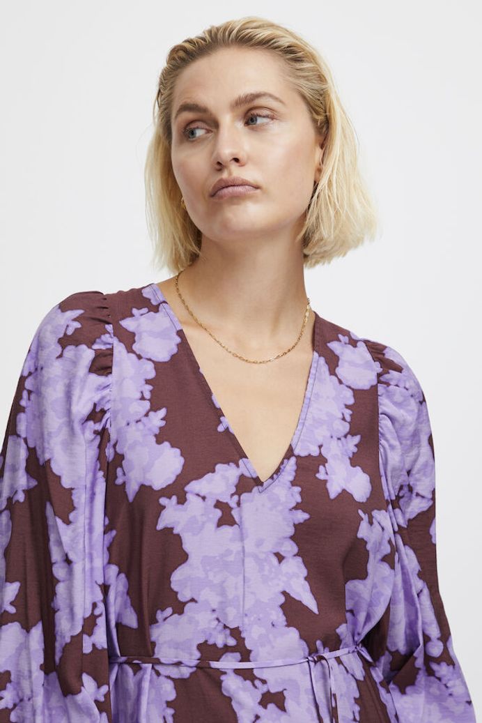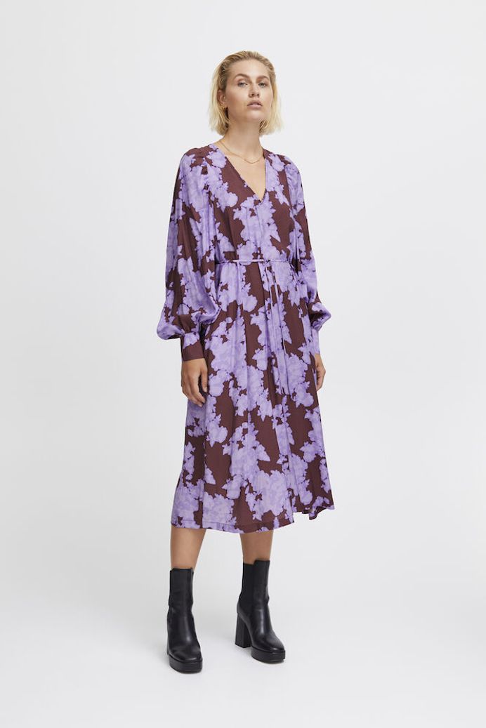 Scopri l’abito lungo marrone e lilla con fiori astratti e crea outfit che non passano inosservati.