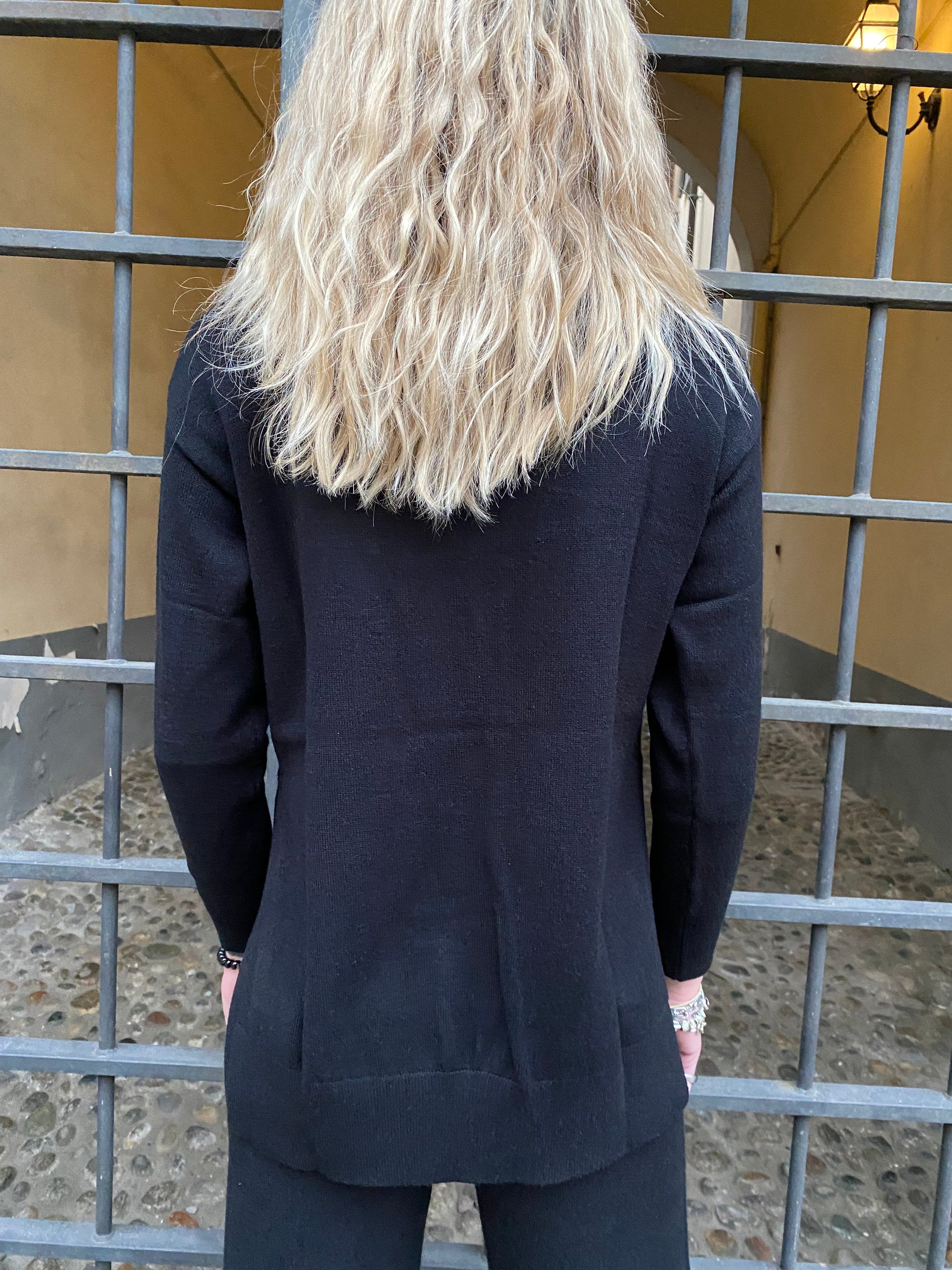 Il collo alto aggiunge un tocco elegante e avvolgente, mentre la lunghezza allungata con spacchi laterali dona movimento e un effetto slanciato, ideale da indossare su pantaloni skinny, leggings o jeans wide per un look equilibrato e sofisticato.
