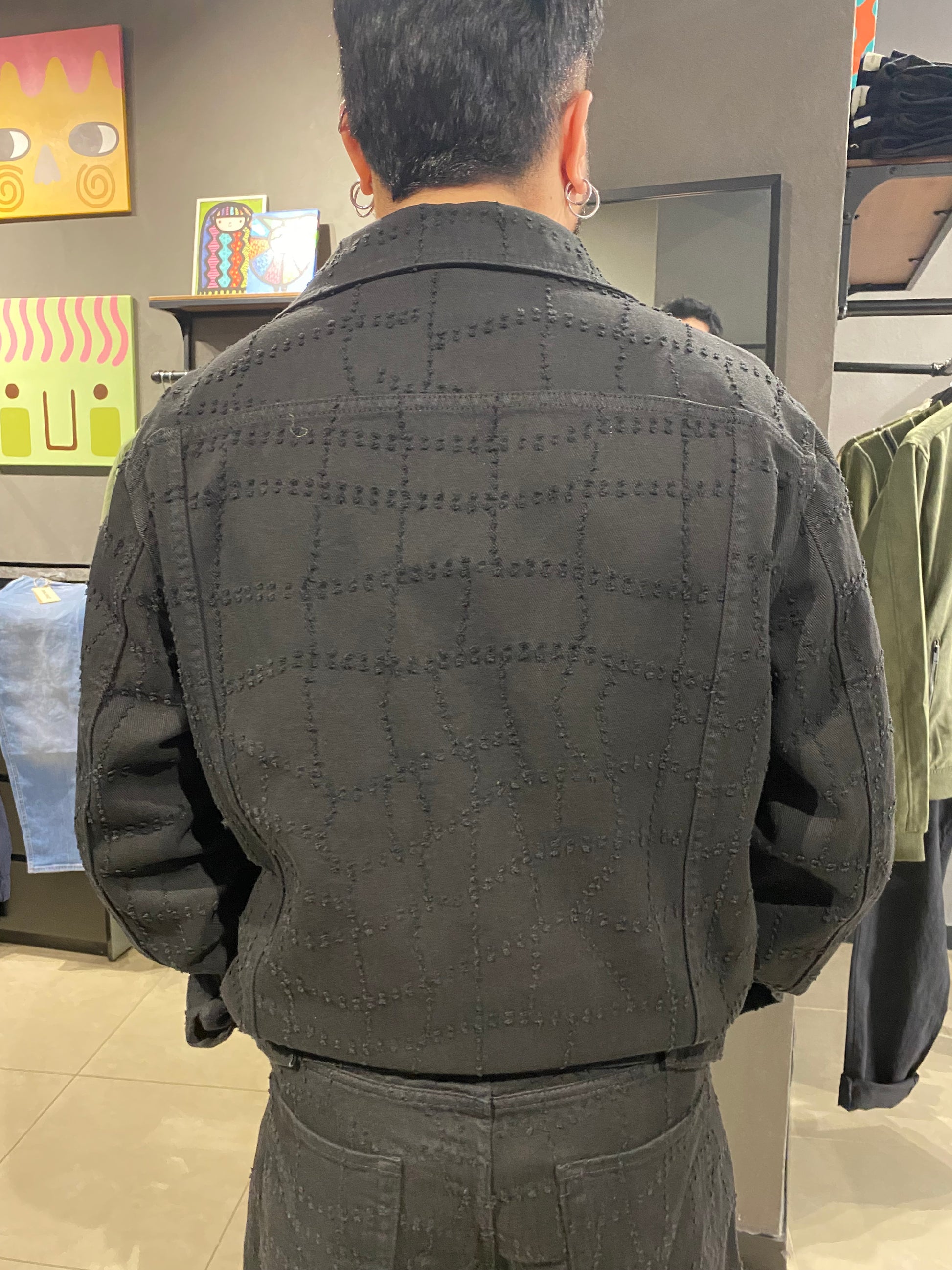 Scopri la forza dello stile con la giacca in black denim lavorata a laser, il capo che combina artigianalità e tendenza in un’unica dichiarazione di personalità.