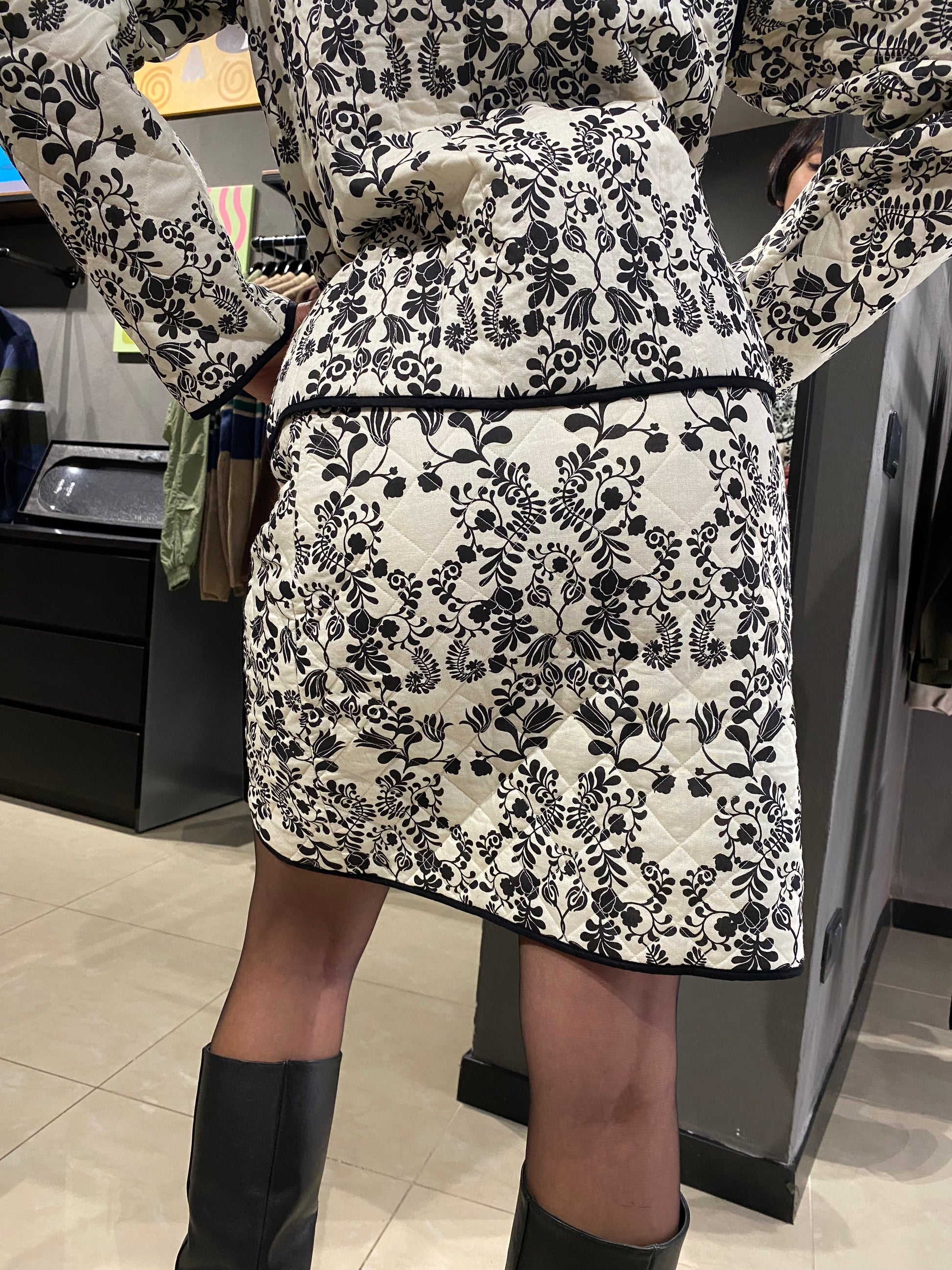 Esalta il tuo stile con la gonna in tessuto jacquard trapuntato, un capo raffinato che unisce texture preziosa e design moderno.
