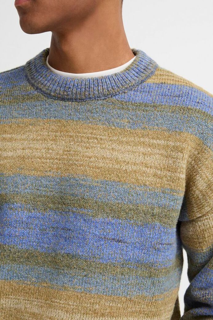 Motivo a righe orizzontali multicolori. Palette calda nei toni del beige, blu e verde oliva. Scollo girocollo con finiture a coste. Vestibilità confortevole e avvolgente. Perfetto per look casual autunnali e invernali.